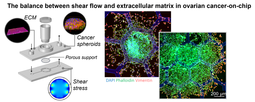 ECM models based on ECM proteins are integrated in microfluidic chips to uncouple the impact of ECM and shear stress in ovarian cancer migration. In the shear stress regime of the peritoneal cavity, the ECM prevails over shear stress. In presence of basement membrane proteins, migration is more collective that on type I collagen regardless of shear stress.